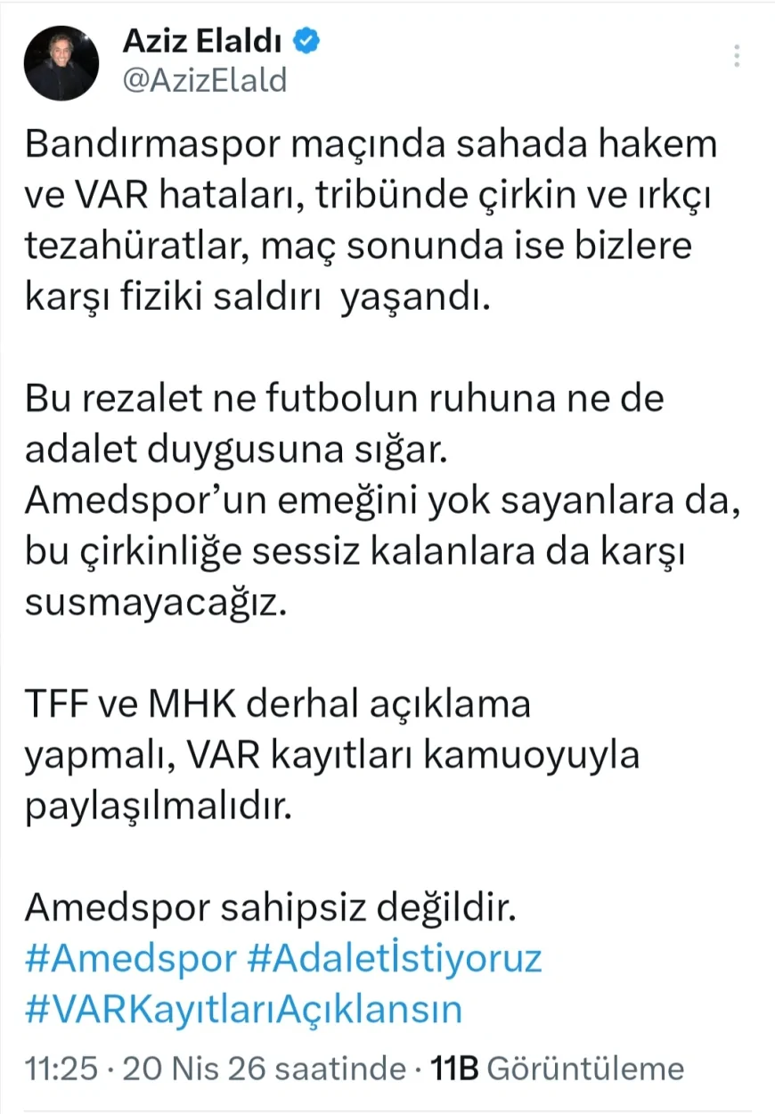 Amedspor eski başkanlarından ve DİMDER Başkanı Aziz Elaldı, Bandırmaspor karşılaşmasının ardından yaptığı açıklamada hakem ve VAR kararlarını eleştirirken, tribünlerde ırkçı tezahüratlar ve maç sonunda fiziki saldırı yaşandığını belirtti, TFF ve MHK’ye çağrıda bulundu.
