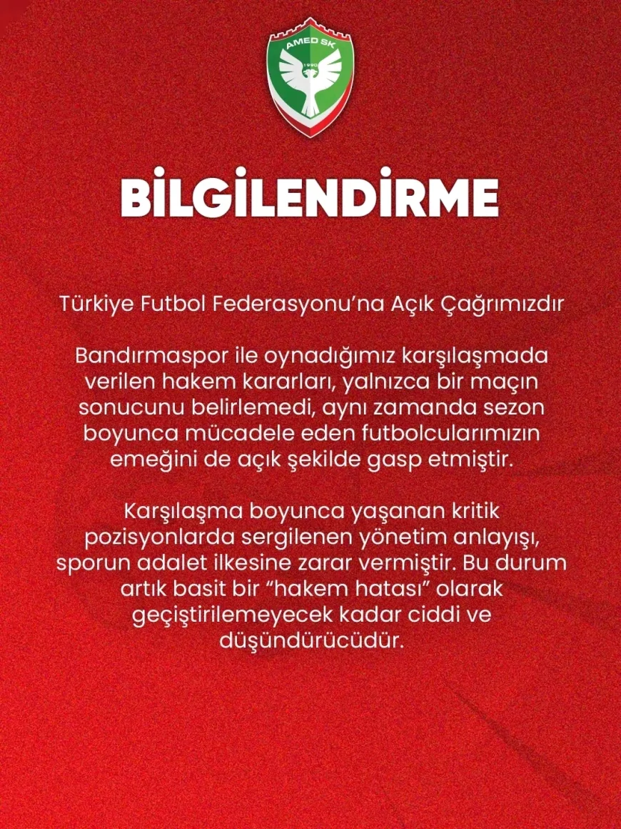 Bandırmaspor ile oynadığımız karşılaşmada verilen hakem kararları, yalnızca bir maçın sonucunu belirlemedi, aynı zamanda sezon boyunca mücadele eden futbolcularımızın emeğini de açık şekilde gasp etmiştir.