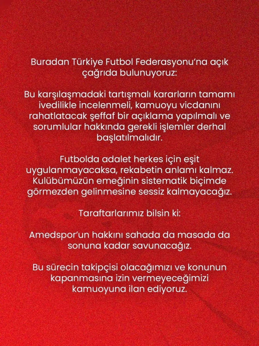Bu karşılaşmadaki tartışmalı kararların tamamı ivedilikle incelenmeli, kamuoyu vicdanını rahatlatacak şeffaf bir açıklama yapılmalı ve sorumlular hakkında gerekli işlemler derhal başlatılmalıdır.